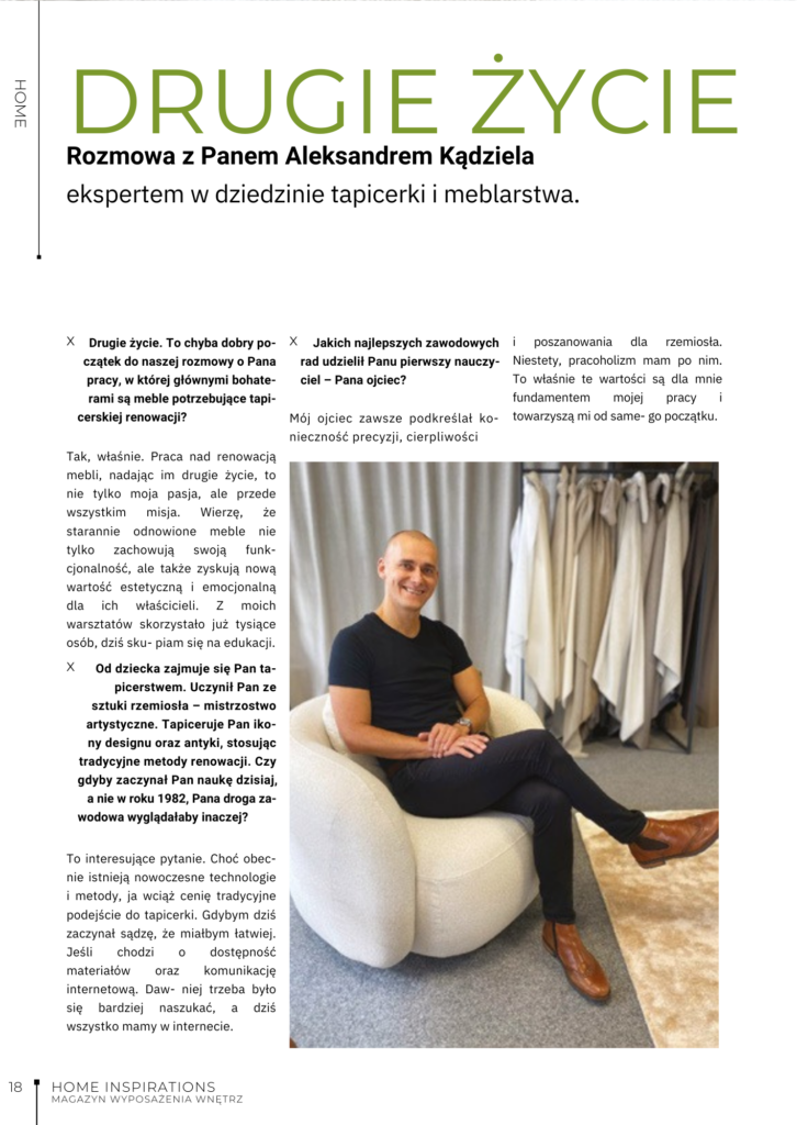 Wywiady z Aleksandrem Kądzielą w mediach obejmują publikacje i materiały poświęcone tapicerstwu, renowacji mebli oraz projektom DIY.