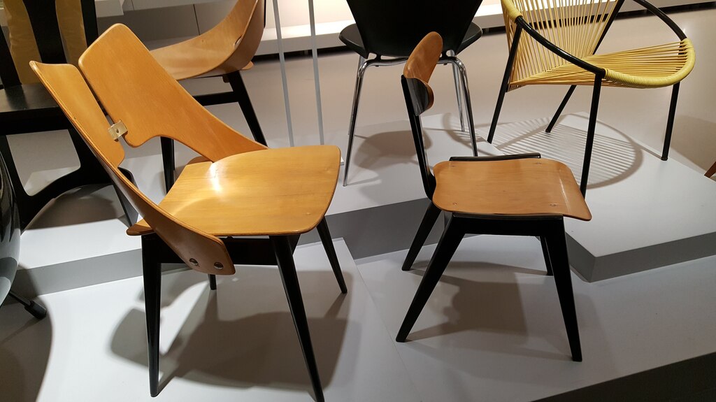 Krzesło Muszelka Teresy Kruszewskiej z 1956 roku należy do najważniejszych polskich projektów z giętej sklejki. Siedzisko i oparcie tworzą jedną spójną formę, a oszczędność środków przekłada się na wyjątkową czytelność projektu.