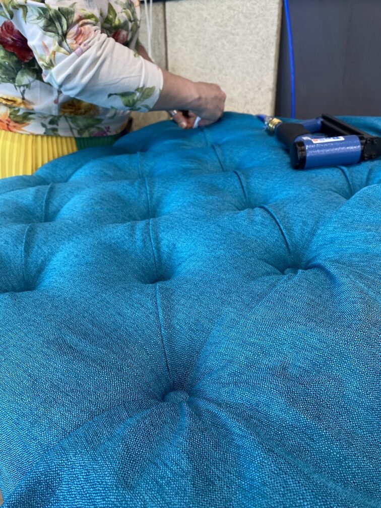 - Niezbędne akcesoria: taśma miernicza, igła do pikowania, guziki tapicerskie, mocna nić typu dratwa oraz sznurek, ułatwiające wykończenie tapicerowanych elementów.
