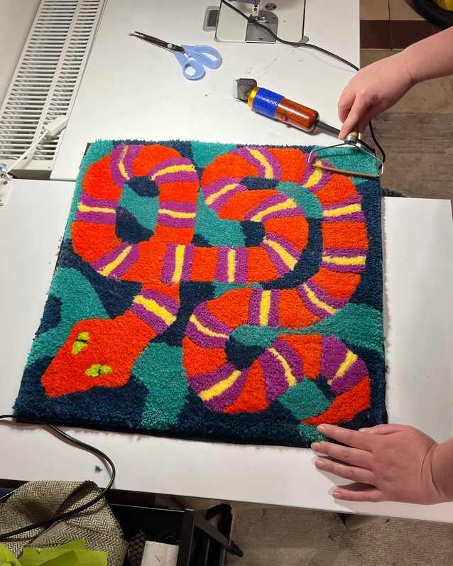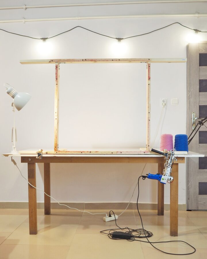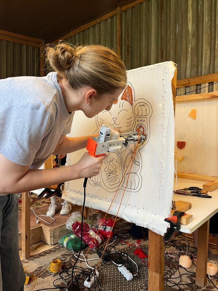 Podczas zajęć nauczysz się pracy z pistoletem tuftingowym (tufting gun) i wykonasz własny projekt – dywan lub obraz tekstylny o wymiarach 50 × 50 cm. Jak wykorzystasz stworzoną tkaninę zależy od Ciebie – możesz stworzyć dywan, obraz tekstylny lub element, który później wykorzystasz przy tapicerowaniu mebla. Decyzję podejmiesz podczas warsztatów.